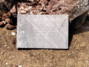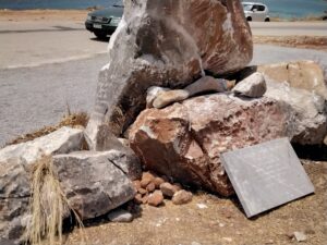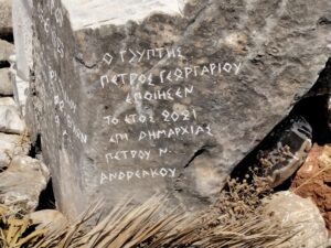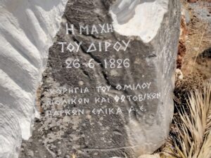 Κοιτώντας το άγαλμα από μπροστά φαίνεται ο δωρητής και στο πλάι ο καλλιτέχνης, ενώ η πλακέτα των φίλων του Διρού στο πίσω μέρος του αγάλματος κρυμμένη μην τυχόν και την κλέψει κανείς!