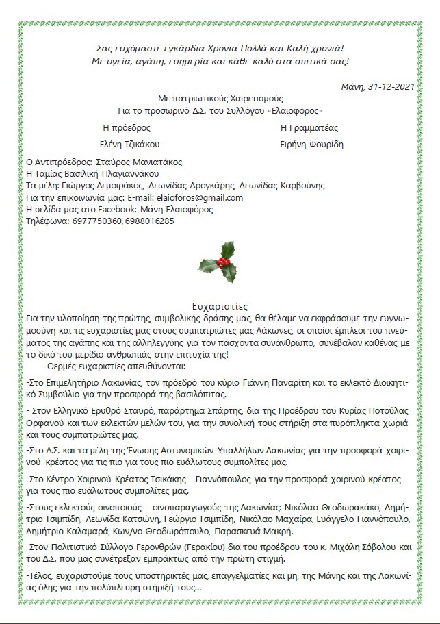 – Τέλος, ευχαριστούμε τους υποστηρικτές μας, επαγγελματίες και μη, της Μάνης και της Λακωνίας όλης, για την πολύπλευρη στήριξή τους…