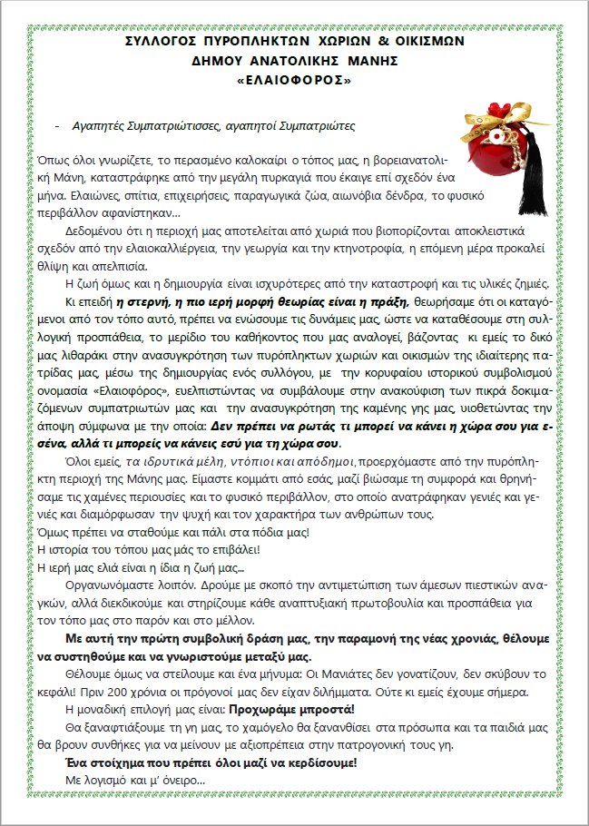 Όπως όλοι γνωρίζετε, το περασμένο καλοκαίρι ο τόπος μας, η βορειανατολική Μάνη, καταστράφηκε από την μεγάλη πυρκαγιά που έκαιγε επί σχεδόν ένα μήνα. Ελαιώνες, σπίτια, επιχειρήσεις, παραγωγικά ζώα, αιωνόβια δένδρα, το φυσικό περιβάλλον αφανίστηκαν…